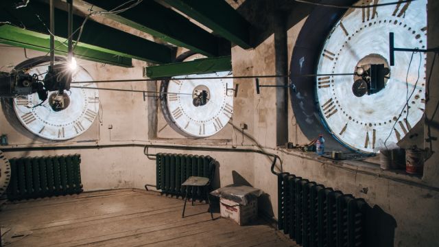Минуя строгую охрану, поднявшись под крышу и пройдя под деревянными лесенками, мы оказываемся в тесной каморке. Именно здесь находится сердце главных городских часов. Внутри они выглядят не так романтично, как нам представлялось. Здесь нет ни гигантских колёс, ни старинных механизмов в стиле стимпанк. А еще здесь тепло даже зимой.
