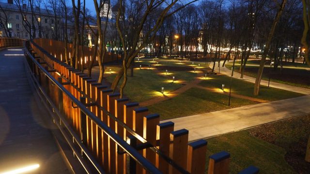 Освещение в обновленном «Орленке» тоже необычное: это не только классические высокие фонари, но и низкие светильники, бросающие яркий отсвет на траву в теневых зонах, и оригинальное освещение моста, где некоторые лампы вмонтированы прямо в покрытие под ногами.
