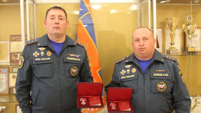 Старшего инструктора-пожарного Сергея Бокова и старшего инструктора газодымозащитной службы Андрея Позднякова наградили «за проявленные в условиях, сопряженных с риском для жизни, отвагу и самоотверженность при тушении пожара, спасении людей и имущества от огня».