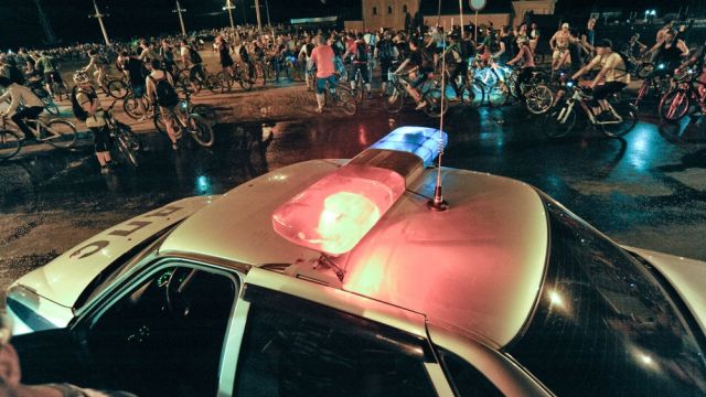 Колонна велосипедистов стартовала от СК Юбилейный около 23:00 (как объяснили организаторы, полиция попросила перенести отъезд с запланированных 21:00 на более позднее время, чтобы не блокировать движение в городе). Впрочем, слово «стартовала» тут не очень-то уместно: когда начало колонны, проехав по Кольцовской до цирка и оттуда по Кирова к проспекту Революции, было уже у кинотеатра «Спартак», замыкающие только отъехали от «Юбилейного». А когда первые велосипедисты съезжали с Вогрэсовского моста, «хвост» колонны только-только покидал Северный мост.