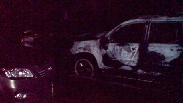 Сгорел припаркованный у дома № 3 «Лексус JX». Также огнем повреждены передний бампер и решетка автомобиля «Тойота РАВ4», задний бампер «Рено Меган».