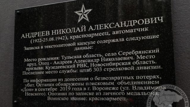 Записку из медальона удалось расшифровать. Николай Андреев родился в 1922 году в селе Серебрянский Пруд Тульской области. Погиб 25 августа 1942 года. Последним местом службы бойца был штаб 303-й стрелковой дивизии. Торжественное захоронение бойца и еще 23 воинов, останки которых были найдены на строительных площадках города, прошло в сентябре 2020 года.