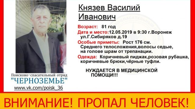 Пожилой мужчина, 81-летний Василий Князев, пропал в Воронеже в воскресенье, 12 мая. Об этом сообщили представители поисково-спасательного отряда «Черноземье».