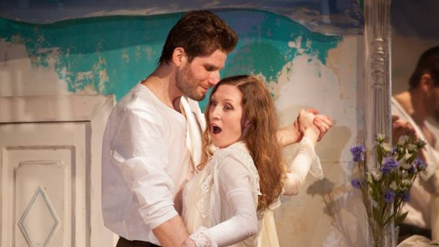 Лоскутные декорации, напоминающие морскую пену и соленые брызги, нежные шифоновые занавески, деревянный светлый пол – воздушное оформление пространства сцены перемещает зрителя то на палубу парохода, то в гостиничный номер. Малая сцена Камерного создает абсолютно комнатную атмосферу – зритель может видеть эмоции героев, легкие движения кружева платья героини, взмахи ее ресниц.