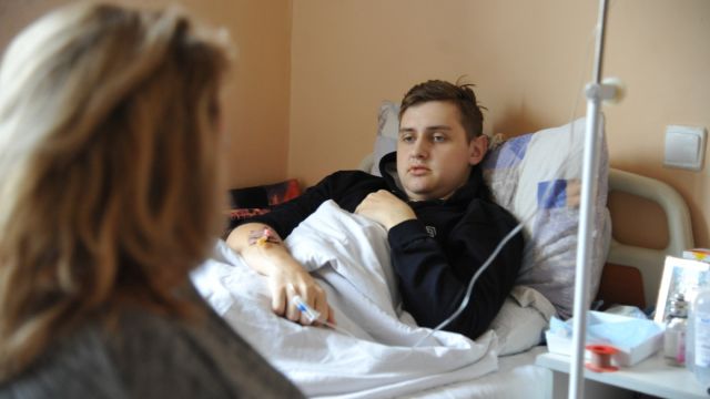 – Я днем с Юрой нахожусь в палате, а на ночь на съемную квартиру уезжаю. Ему одному сейчас никак нельзя. Он с раннего утра до позднего вечера под капельницами. Вот эти четыре флакона только на обеденное время. Сын даже с капельницей в туалет ходит, перенося стойку. Очень слабый, да еще недавно десна отекли – ему разговаривать, есть больно. Из еды только бульоны и протертую пищу может употреблять, – рассказывает мама Юры Светлана Жемойтель. – Нам сказали, что лечение будет сложным и вообще пока непонятно, как оно будет развиваться. Мы все убиты этим диагнозом. Ведь еще 1,5 месяца назад и намека на такую беду не было. У нас была счастливая жизнь, которая теперь превратилась в кошмар.
