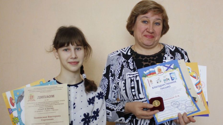 Ученица Бродовской школы Аннинского района, 16-летняя Екатерина Зименская, вошла в число победителей VI Международного конкурса научно-исследовательских и творческих работ учащихся «Старт в науке». Преподавателю школьницы, 49-летней Ольге Колмаковой, вручили медаль Константина Ушинского. Об этом корреспонденту РИА «Воронеж» сообщила директор Бродовской средней школы Марина Порокина в четверг, 7 марта.