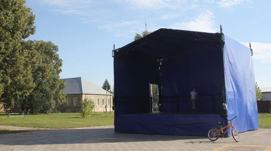 Площадь подиума – почти 29 кв. м, высота тентованного павильона – 4,5 м. Настил выполнен из влагостойкой фанеры с противоскользящим покрытием. Для поднятия на сцену есть лестница. При проведении мероприятий сцену будут освещать четыре прожектора. Эстраду разместили на выровненной площади в 100 кв. м.