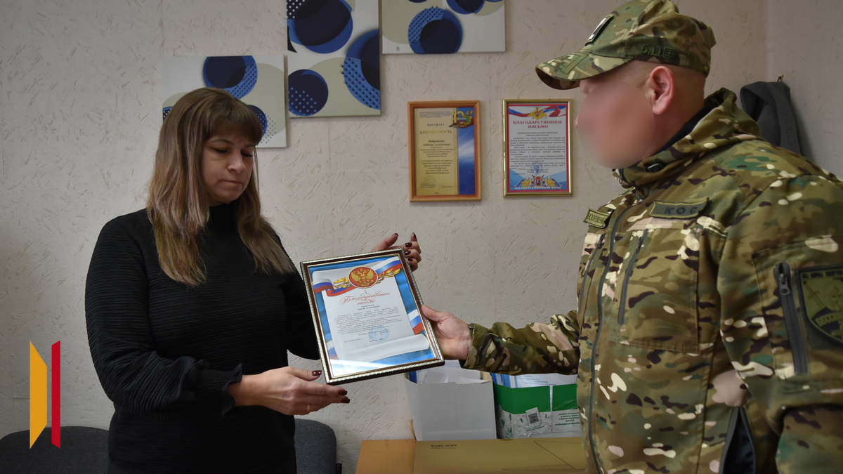 От командования войсковой части Андрей передал директору благотворительного фонда «Грибановский» Любови Бобровских благодарность за активную гражданскую позицию и поддержку военнослужащих, выполняющих боевые и специальные задачи в интересах СВО.