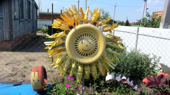 - Мне хотелось доставить радость своим детям, - говорит Наталья. - К тому же меня захватывает сам процесс изготовления садовых поделок. Например, из пластиковых бутылок и нескольких палочек можно в течение получаса создать удивительной красоты каллы или разноцветные ромашки. А вот чтобы получился жираф, необходимо всего несколько бревнышек и краска.