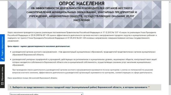 При проведении опроса оценивается деятельность руководителей, депутатов, транспортных, медицинских, коммунальных служб. Для отправки сообщения необходимо ввести свои персональные данные.