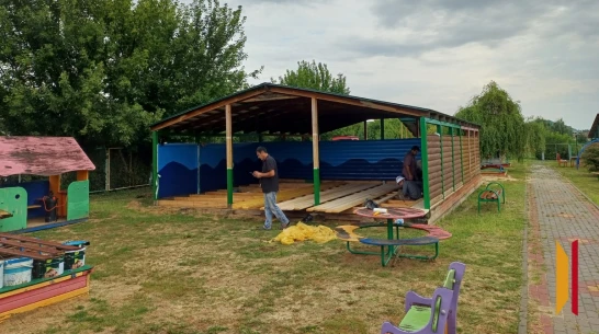Рабочие уже частично заменили систему отопления в правом и левом крыле здания. Новые радиаторы отопления появились в нескольких группах, музыкальном и спортивном зале. Сейчас строители занимаются обновлением трех навесов от солнца на улице.
