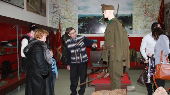 В экспозиции представлена отреставрированная военная форма советских и немецких солдат, предметы быта и вооружения.