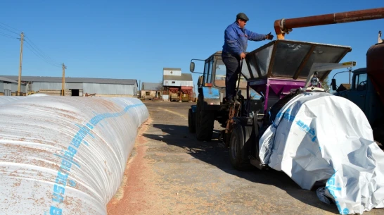 В хозяйстве «Вязноватовка» освоили новую технологию хранения зерна кукурузы – с помощью мешков-рукавов, которые позволяют сохранить влажное зерно. В гигантские мешки зерно утрамбовывают с помощью специальной установки-плющилки.
