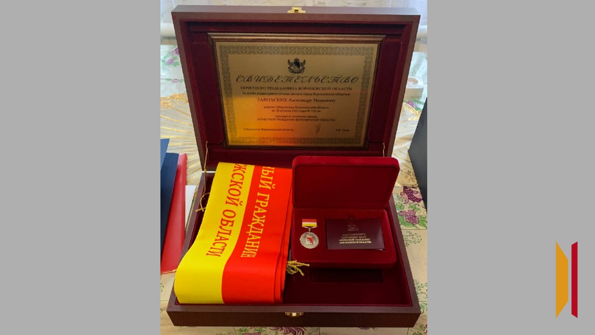 Почетным гражданином Воронежской области стал участник Великой Отечественной войны из села Чернавка Панинского района 99-летний Александр Заводских. Почетный знак, памятную ленту и свидетельство ветерану вручила первый заместитель руководителя аппарата губернатора и правительства области Ольга Извекова. Также она зачитала поздравление от губернатора Воронежской области Александра Гусева.
