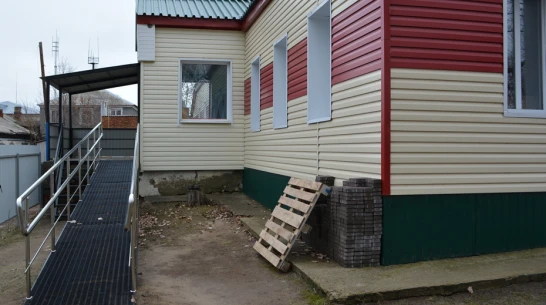 Рабочие демонтировали старые ступеньки, укрепили фундамент крыльца, установили навес, сделали новые железные ступеньки и пандус с поручнями.