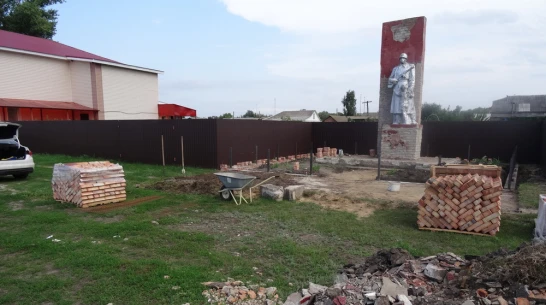 Рабочие сняли старую облицовку со стелы и тумбы. Их обложат керамической плиткой, фигуры воина и ребенка покрасят акриловой краской. Дорожку и основание памятника выложат брусчаткой, установят новое ограждение.