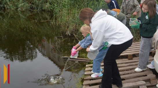 Рыбу в водоем запустили дети под руководством взрослых. Они сами переносили мальков в озеро в маленьких и больших ведрах.