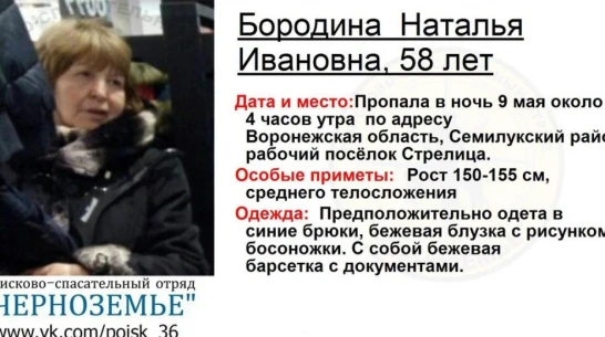 Наталью Бородину, которая пропала в рабочем поселке Стрелица Семилукского района, нашли в Московской области. Женщина попала в больницу, сообщили представители поискового отряда «Черноземье» в пятницу, 25 мая.