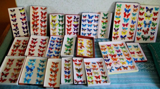 Лина Ивановна бережно достает коробки из-под конфет - и там тоже бабочки, сотни ярких созданий, сделанных из фантиков от конфет.