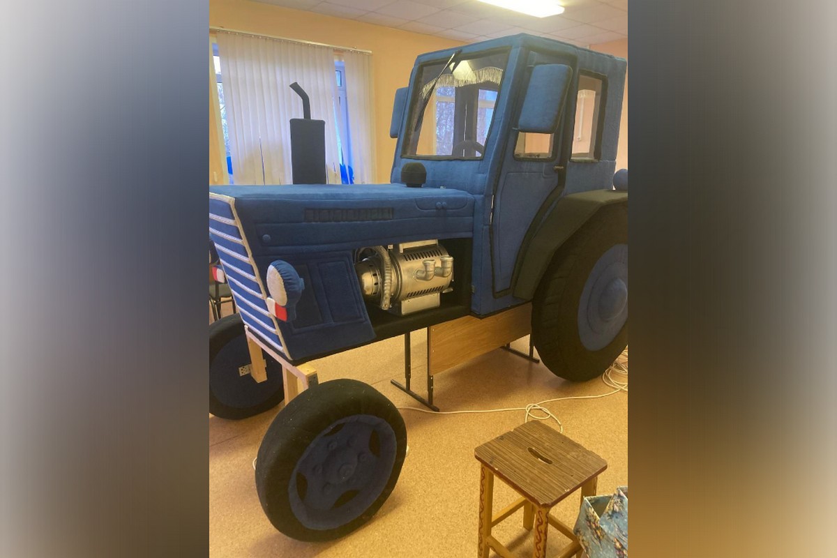 – Изначально планировала сшить маленький трактор, но мужчины – сотрудники РДК – посоветовали не мелочиться, а сшить технику в натуральную величину, – сказала Оксана Алексеевна. – Я подумала и согласилась. Поехала и измерила параметры МТЗ-80, и в течение недели кипела работа. Коллеги сделали каркас из реек, а я обтянула их утеплителем и тканью. На колеса пошел толстый поролон, руль – из ДВП и материала. Для мотора мужчины взяли старый софит, немного доработали его и покрасили серебрянкой.