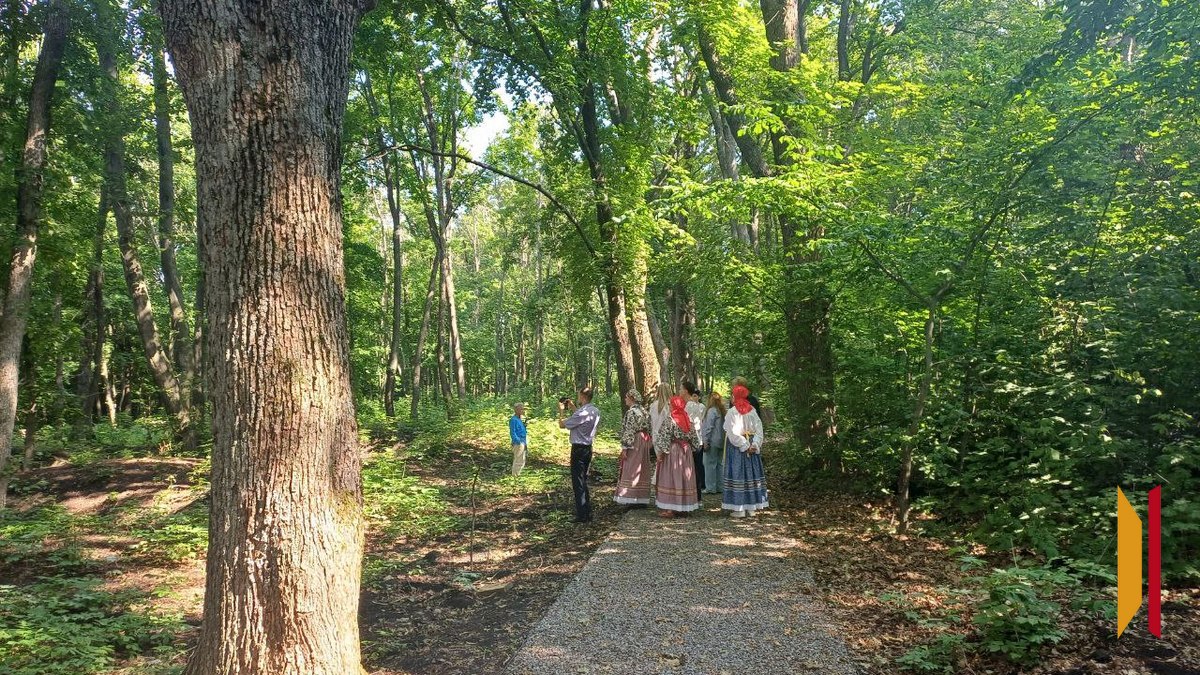 Режиссер Никольского народного театра Татьяна Гречаникова провела для гостей познавательную экскурсию. В этом ей помогли директор усадьбы Соколовых Елена Малюгина и другие сотрудники учреждения. Все они были одеты в нарядные сценические костюмы. Первым делом гости прогулялись по театральной аллее, ведущей к железнодорожной станции.
