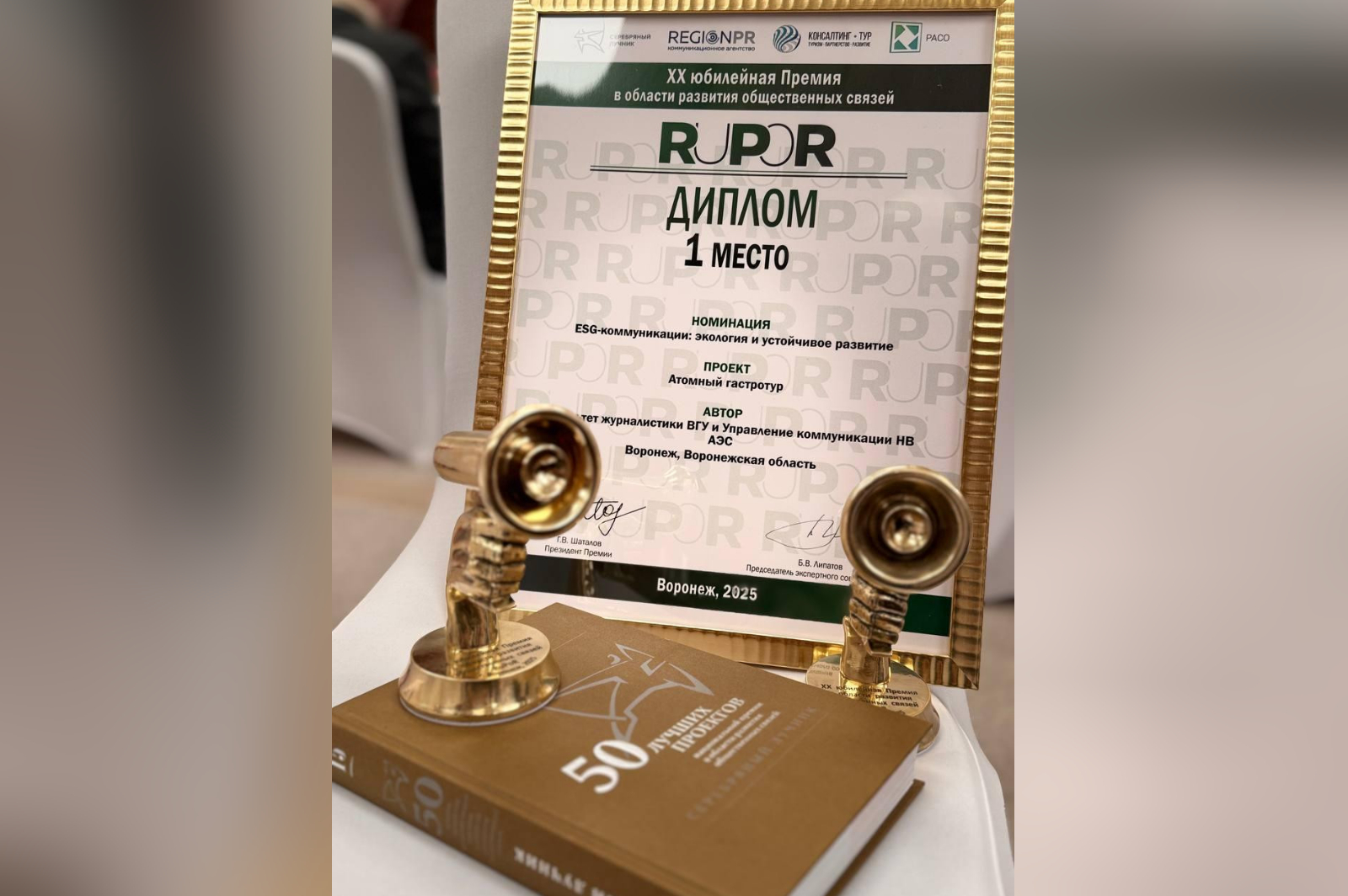 Совместный коммуникационный проект Нововоронежской АЭС и факультета журналистики Воронежского госуниверситета «Атомный гастротур»* стал обладателем гран-при XX премии в области развития общественных связей RuPoR**, а также занял первое место в номинации «ESG-коммуникации: экология и устойчивое развитие».