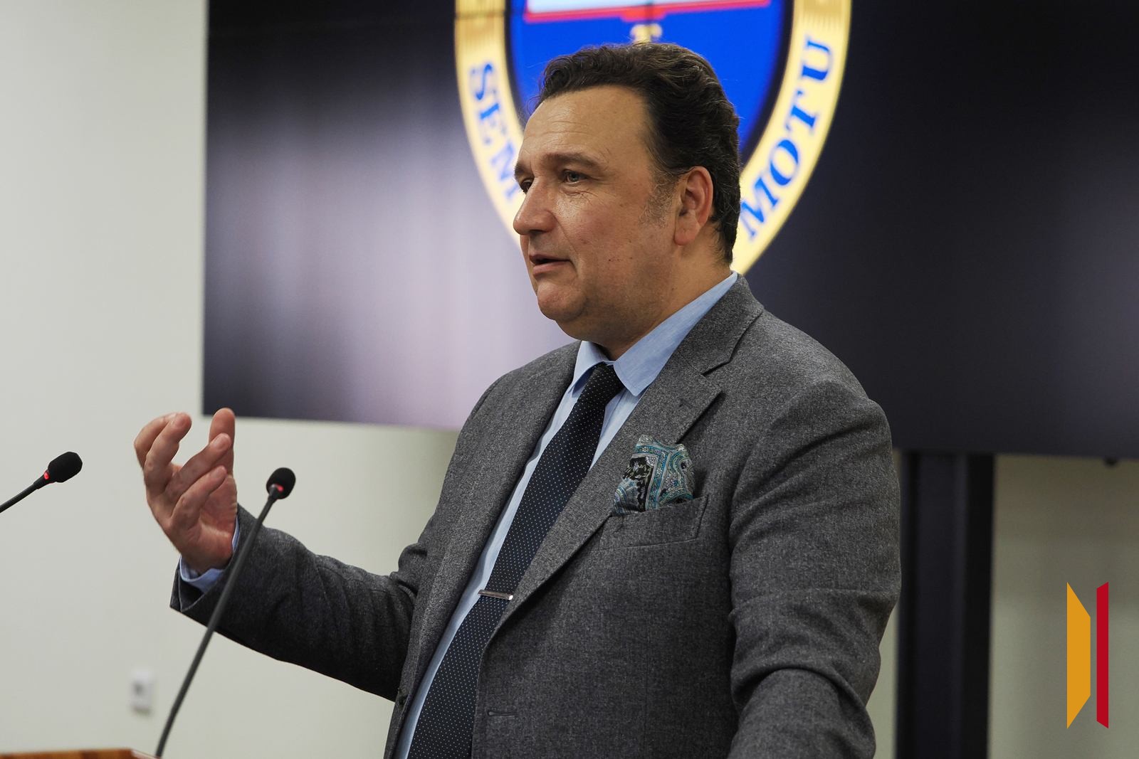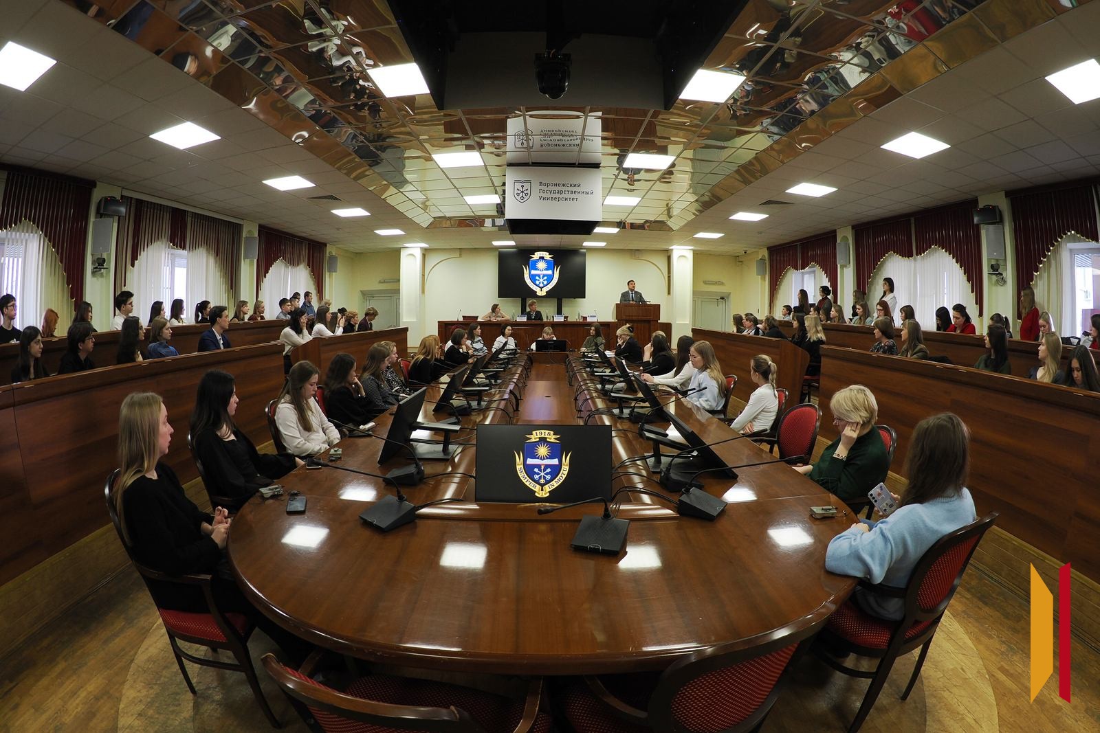 Французский юрист, политический обозреватель российских государственных СМИ Арно Девеле выступил перед воронежскими студентами и преподавателями с лекцией на английском языке «Крах послевоенного международного однополярного правопорядка». Доклад гостя был посвящен становлению многополярности мира, конфликту на Украине и сегодняшнему положению дел в Европе. Встреча прошла в конференц-зале главного корпуса Воронежского государственного университета в среду, 26 ноября.