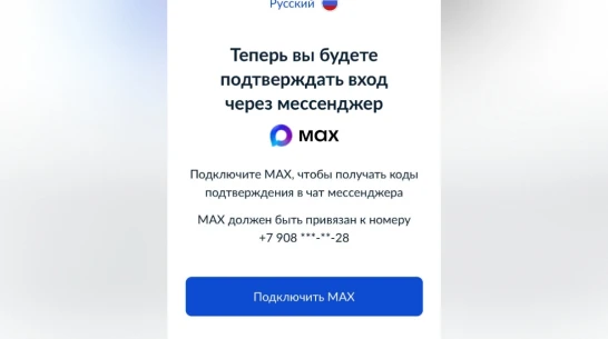 Вход на портал «Госуслуги» сопровождается надписью «Теперь вы будете подтверждать вход через мессенджер MAX». Коды подтверждения входа будут отправляться в чат мессенджера.
