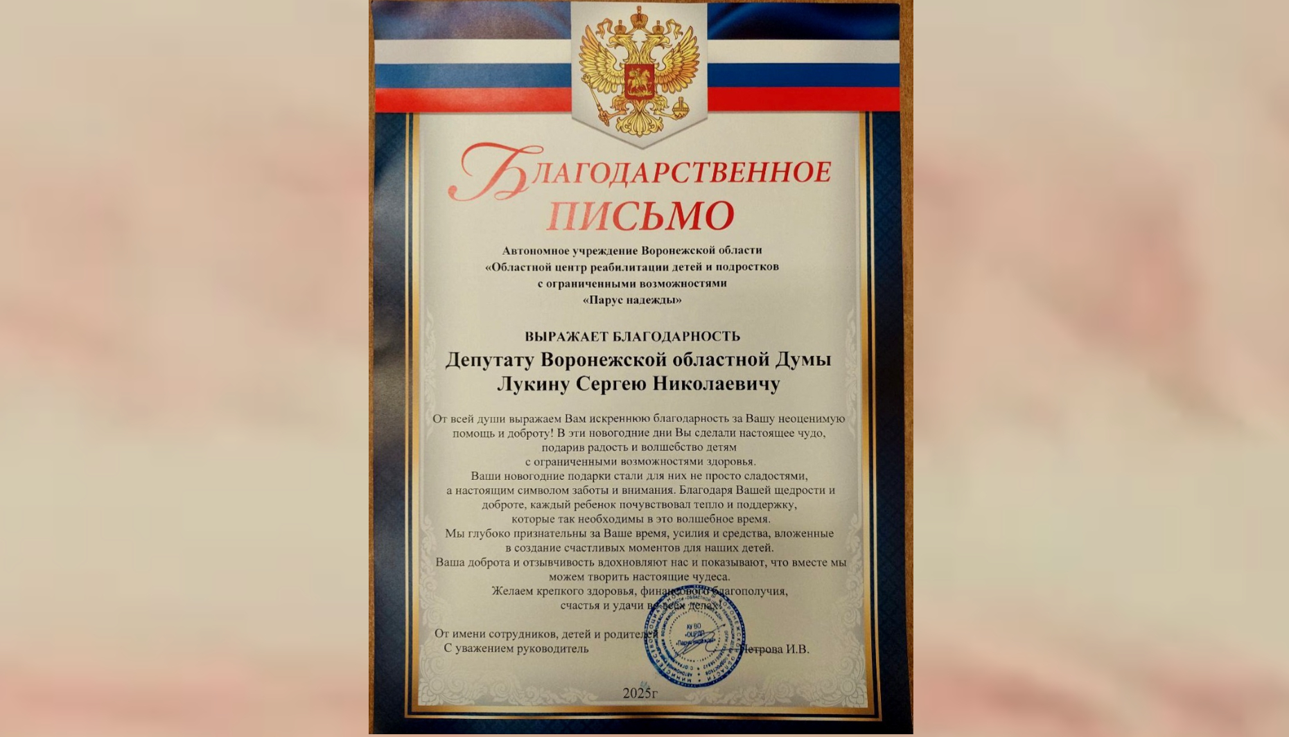 Особое внимание в 2025 году, как и всегда, было уделено семьям защитников Отечества. По инициативе Сергея Лукина праздничные сладкие наборы были переданы Воронежской региональной организации семей военнослужащих, погибших при исполнении долга в Афганистане, на Северном Кавказе и в других локальных конфликтах. Подарки предназначены детям погибших героев, в том числе в ходе СВО, а также детям ветеранов и инвалидов боевых действий.