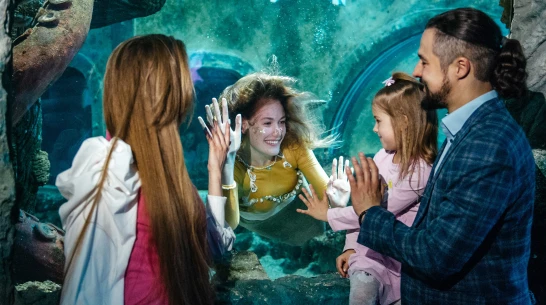 Подводные шоу с элементами театрализации в океанариуме не редкость. Главные роли в них, от волшебника Деда Мороза до космического астронавта, исполняют водолазы с соответствующим снаряжением и экипировкой. Русалка – совсем другое. Здесь образ максимально реалистичный, открытый для зрителя. Исполнительница погружается под воду без снаряжения, исключительно на задержке дыхания, используя профессиональные навыки плавания, «рыбий» костюм и немного волшебства.