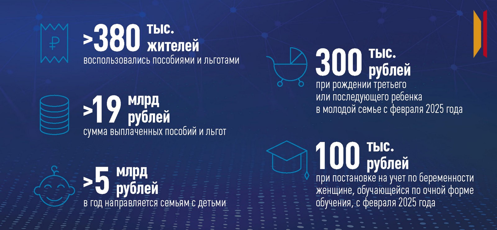 Что касается поддержки семей, в том числе многодетных, то в прошлом году на эти цели было направлено около 5 млрд рублей из областного бюджета и 380 млн рублей из федерального бюджета. Чаще всего семьи пользовались такими мерами поддержки, как единовременная денежная выплата при рождении второго ребенка, региональный материнский капитал, ежемесячная денежная выплата на третьего ребенка или последующих детей, субсидия на оплату жилого помещения и коммунальных услуг.