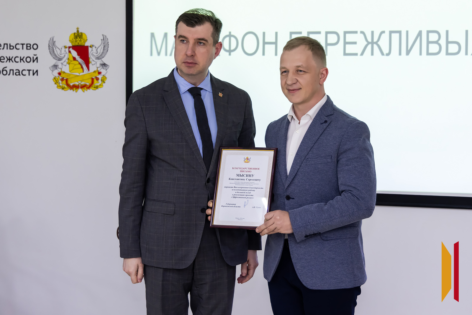 После знакомства с лучшими практиками состоялась церемония награждения. Благодарственные письма от губернатора Александра Гусева за плодотворную работу и большой вклад в реализацию проекта «Эффективный регион» получили кураторы от Нововоронежской АЭС, которые помогают в реализации бережливых проектов в органах власти: инженер управления инженерной поддержки филиала АО «Концерн Росэнергоатом» Оксана Попова и начальник смены реакторного цеха № 6 филиала АО «Росэнергоатом» Нововоронежская АЭС Константин Мысин. Благодарственные письма им вручил первый заместитель председателя правительства Воронежской области Данил Кустов. Он отметил огромный вклад всех участников в реализацию проекта «Эффективный регион».