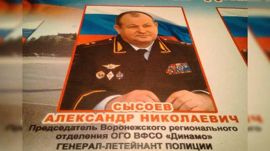 Ошибка на баннере с изображением начальника регионального ГУ МВД, экс-председателя Воронежского регионального отделения физкультурно-спортивного общества «Динамо» Александра Сысоева вызвала обсуждение в соцсети. Фото плаката, размещенного в вестибюле спорткомплекса «Динамо» по улице Ленина, 2, опубликовал Евгений Дроздов на странице Facebook в среду, 22 ноября.