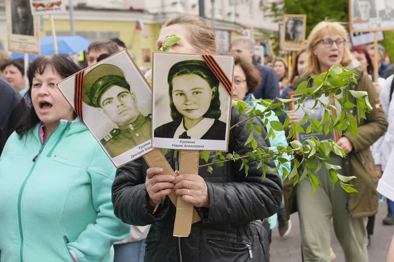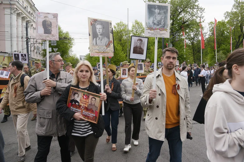 Были среди участников шествия и воронежцы, которые принесли в руках фотографии современных героев, погибших в Донбассе. Среди них – блогер и общественный деятель Евгения Шкарина, которая пришла на памятную акцию с маленьким сыном Антоном. Она сама несла в руках портреты дедушек и прадедов, а малыш высоко поднимал портрет «дяди Антона» – друга Евгении Антона Фатулаева, погибшего в Донецкой Народной Республике в 2014 году. Своего сына девушка назвала в его честь.