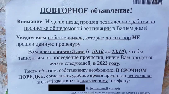 Корреспондент РИА «Воронеж» позвонил по номеру из объявления. На том конце провода сработал автоответчик. Мужской голос сообщил, что прочистка вентиляции займет 15 минут. А все, что нужно от жильцов дома, – подготовить пакет для мусора и оплатить 1 290 рублей. После автоответчик предложил оставить свой адрес.