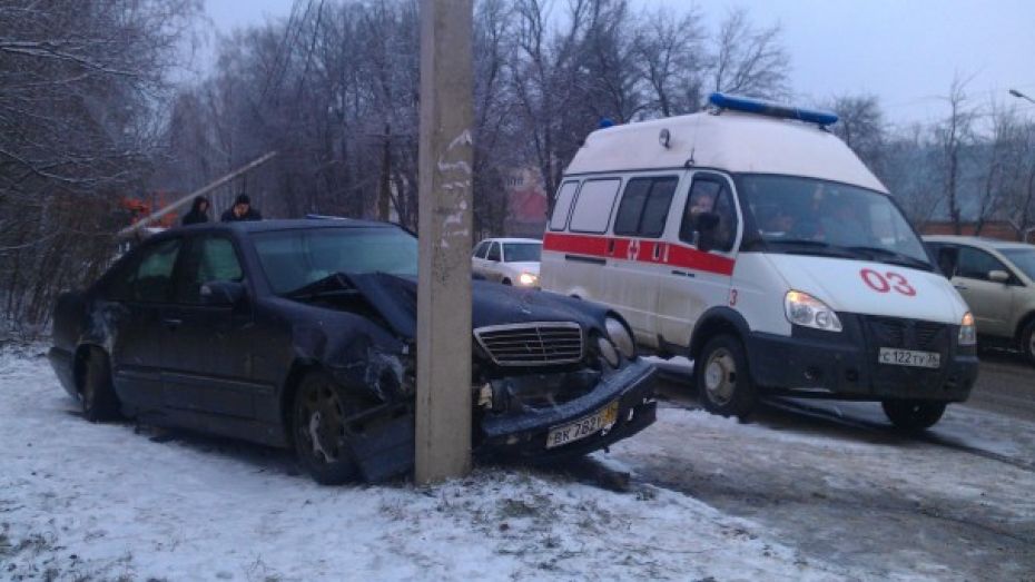Сегодня днем в районе пересечения улиц Морозова и Тимирязева «Мерседес», двигавшийся со стороны улицы Ломоносова, зацепил машину скорой помощи. Иномарку занесло и она протаранила опору линии электропередач, а потом врезалась в следующий столб.