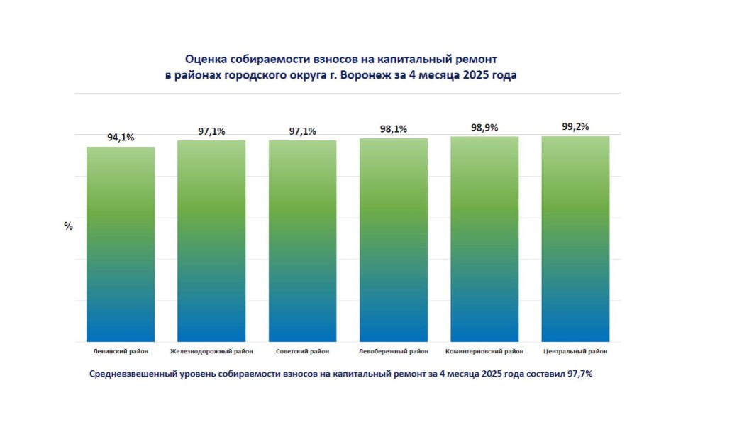 Что касается областного центра, то в среднем по городу собираемость взносов составила 97,7%. Наиболее высокие показатели отмечены в Центральном (99,2%), Коминтерновском (98,9%) и Левобережном (98,1%) районах.
