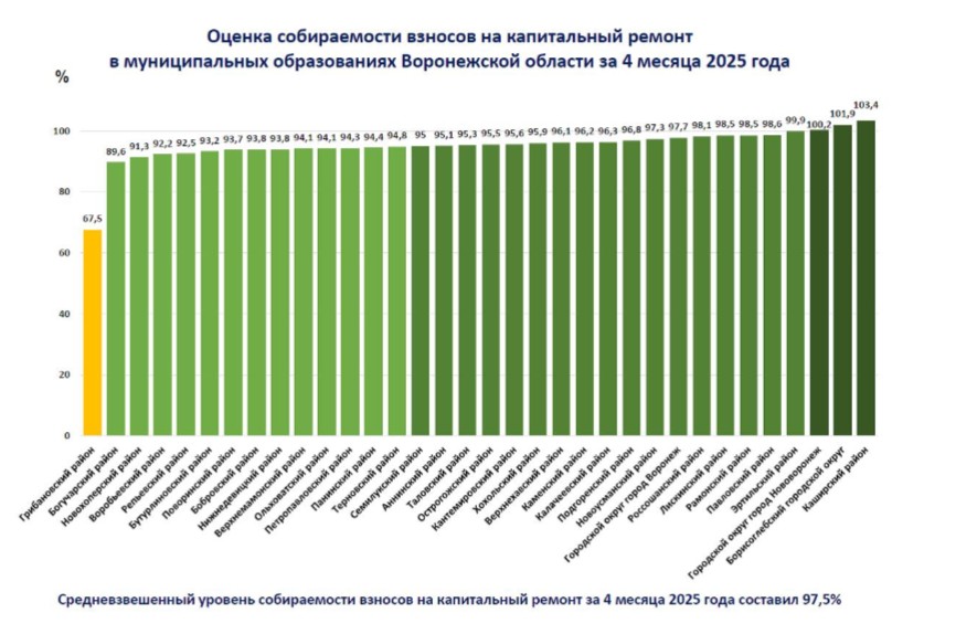 В 12 районах Воронежской области уровень собираемости взносов на капитальный ремонт находится в диапазоне от 95% до 97,7%. В 13 муниципалитетах доля выплаченных взносов составляет от 89,6% до 94,8% от начисленной суммы. Безоговорочным аутсайдером стал Грибановский район с показателем 67,5%.