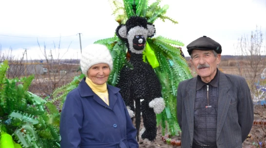 Анна Пшеничных сделала обезьянку своими руками из подручного материала. В ход пошла веревка из полиэтилена. Пальмы пенсионерка смастерила из пластиковых бутылок.