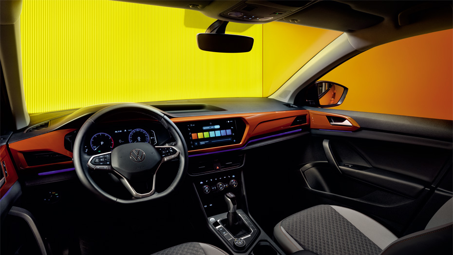 Интерьер Taos в данном исполнении отличают декоративные вставки JOY оранжевого цвета, тканевая обивка сидений Epox с оранжевыми элементами и атмосферная подсветка (десять цветов). Модель также оборудуется противоугонной системой с датчиком присутствия в салоне, системой бесключевого доступа и запуска двигателя KeylessAccess с блокировкой замков Safelock и камерой заднего вида с омывателем.