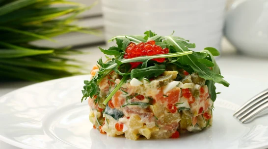 Оливье окажется самым дорогим салатом на новогоднем столе у воронежцев. За четыре порции придется отдать 576 рублей. Цена рассчитывалась исходя из следующего состава: 400 г вареной колбасы, 400 г маринованных огурцов, 380 г зеленого горошка, 200 г майонеза, 4 яйца, 400 г картофеля, 200 г моркови и 100 г репчатого лука. Цену рассчитало РИА Новости по данным Росстата.