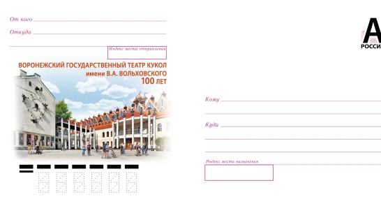 В честь 100-летия Воронежского государственного театра кукол имени Валерия Аркадьевича Вольховского Почта России выпустила новый художественный конверт. На нем изображены здание театра, площадь перед ним и знаменитые часы с трубящими скоморохами. Об этом сообщили в пресс-службе Почты России в среду, 8 октября.