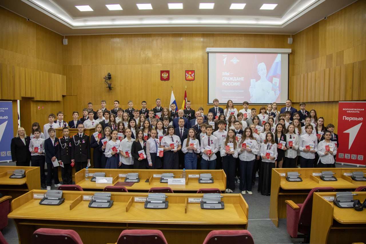 В Воронежской областной думе состоялась торжественная церемония вручения паспортов РФ 14-летним жителям региона. В общей сложности документы получили около 100 мальчишек и девчонок. Паспорта вручал председатель Воронежской областной думы Юрий Матузов. Мероприятие прошло в День Конституции РФ, 12 декабря.