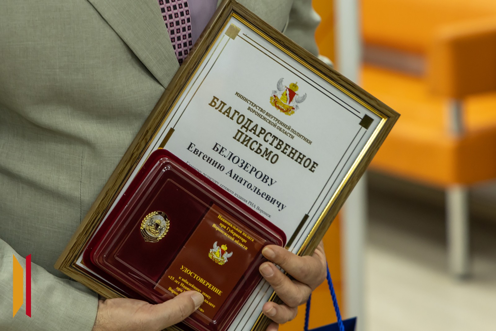 Кроме того, в рамках встречи в РИА «Воронеж» благодарственным письмом министерства внутренней политики региона в честь 15-летия Национальной палаты при губернаторе Воронежской области был отмечен главный редактор интернет-газеты «Воронеж многонациональный» (входит в медиахолдинг. – Прим. ред.) Евгений Белозеров. Письмо ему вручил ведущий советник отдела взаимодействия с институтами гражданского общества регионального министерства внутренней политики Воронежской области Сергей Казаров.