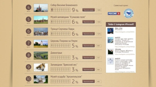 С 25 марта по 29 сентября телеканал «Россия 1» и Русское географическое общество проводят мультимедийный проект-конкурс «Россия 10».