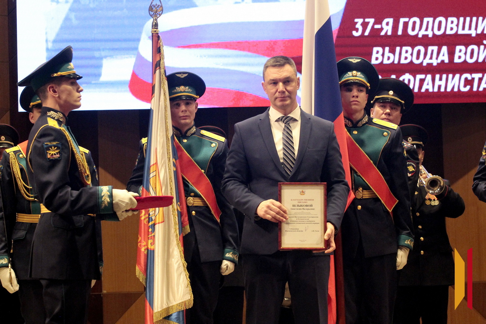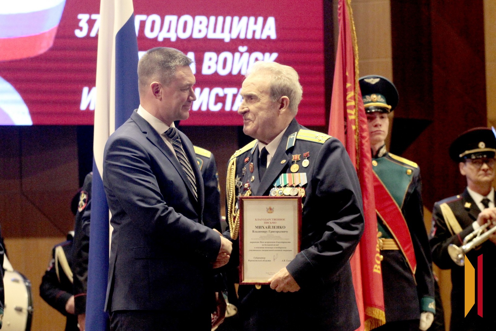 Благодарственным письмом губернатора Воронежской области были отмечены полковник в отставке, летчик Владимир Михайленко, который сейчас возглавляет региональное отделение Общероссийской общественной организации «Российский Союз ветеранов Афганистана и специальных военных операций», а также Анастасия Шлыкова, которая входит в состав вышеуказанной организации.