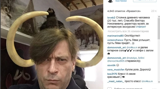 Солист рок-группы «Би-2» Лева разместил в Instagram шуточное фото с мамонтом из Хохольского музея-заповедника «Костенки» в субботу, 12 марта. Музыкант сделал селфи на фоне огромных бивней животного, получившихся на снимке словно рога.