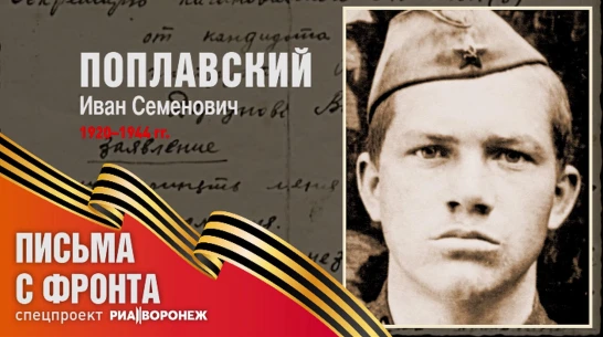 Иван Семенович Поплавский родился в 1920 году в хуторе Залесный Калачеевского района Воронежской области. Был призван в армию еще до начала войны. Служил в роте минеров. Сохранилось 29 его писем к родителям и младшему брату Василию. Иван наказывал ему быть помощником маме в случае ухода отца на фронт. Из дома бойцу часто присылали районную газету, за что Иван благодарил родных: «Прочитаешь газету, так как будто живешь с районом». Последнее письмо датировано октябрем 1943 года, потом от него долго вестей не было.