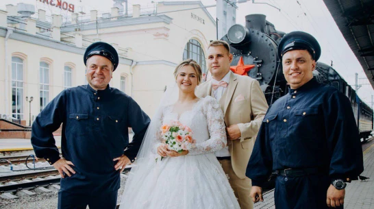 На перроне жениха и невесту ждал украшенный паровоз, машинист поздравил пару с бракосочетанием длинным гудком. На станции Графская влюбленных встретили с традиционным караваем. Также паре организовали оригинальную фотосессию в экспозиции «Зал ожидания XIX века».