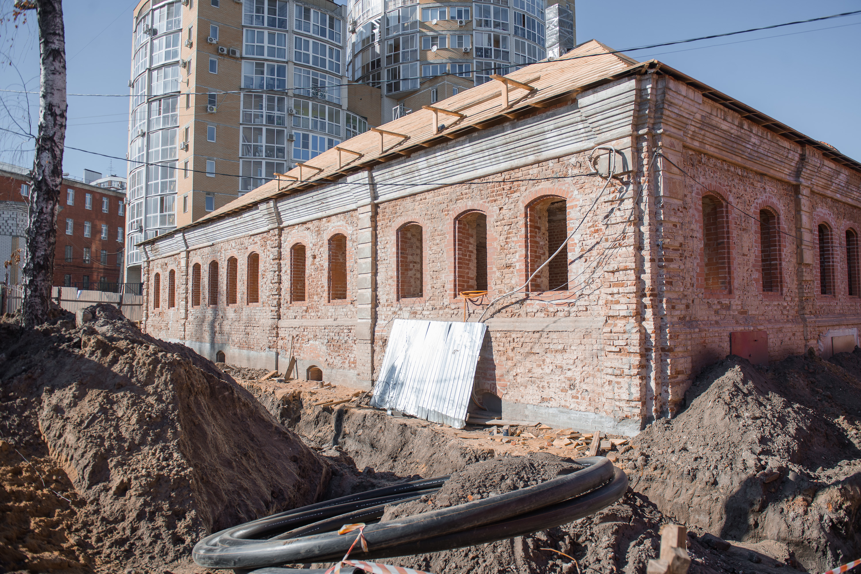 Сейчас специалисты занимаются очисткой цокольного этажа здания. Также они усилили стены методом инъектирования и установили гидроизоляцию. Помимо этого, были установлены стропила, уложены слои паро- и ветрозащиты. Оконные проемы восстановлены, ризалиты укреплены, а балки перекрытий установлены. Начался процесс выноса газопровода, который необходим для подготовки к благоустройству территории.